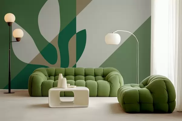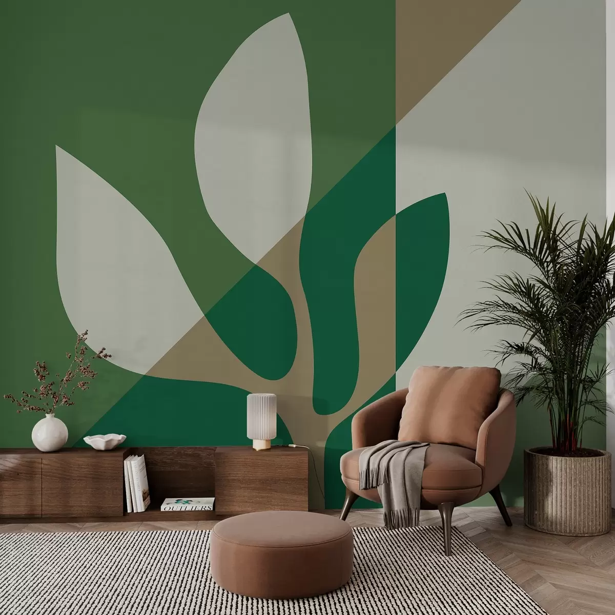Fototapet plantă abstractă grafică pe fundal de geometrie în culori verde și ocru Nr. w04028