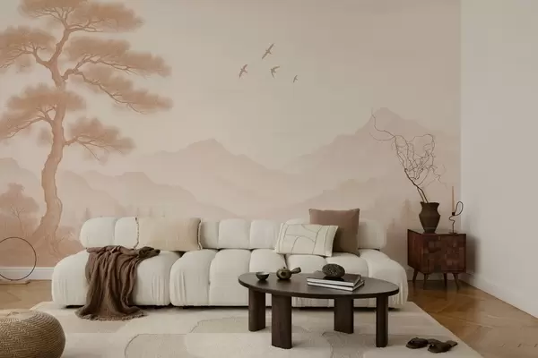 Fototapet panorama de dealuri cu un copac mare în nuanțe de mocha Nr. w04033v1