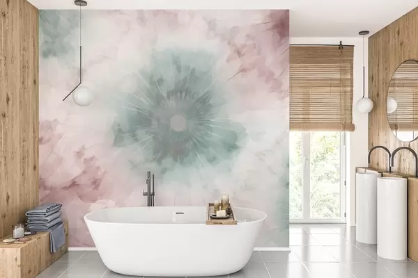 Fototapet Model radial de acuarelă care îmbină verdele cețos și rozul prăfuit, evocând moliciunea roua de dimineață și prima respirație a zilei Nr. w04036v2