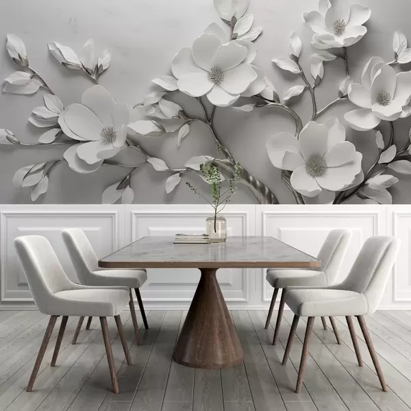 Fototapet Ramură florală dimensională în alb pur și tonuri neutre Nr. w04039v2