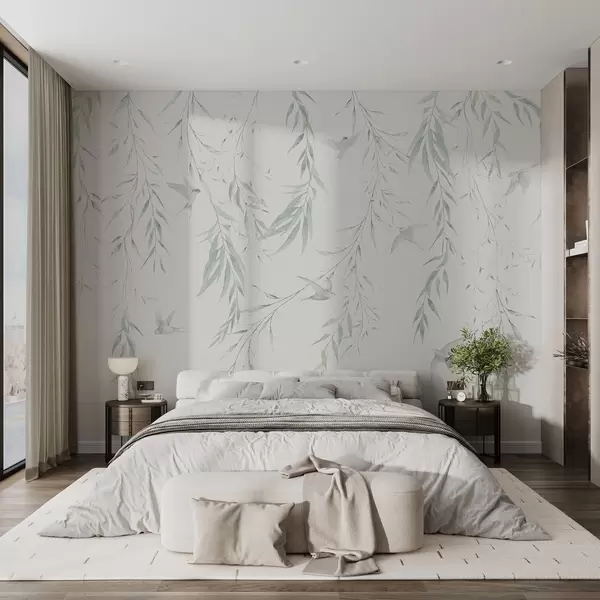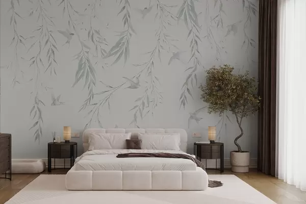 Fototapet Crenguțe cu frunze verzi agățate și păsări Nr. w04052