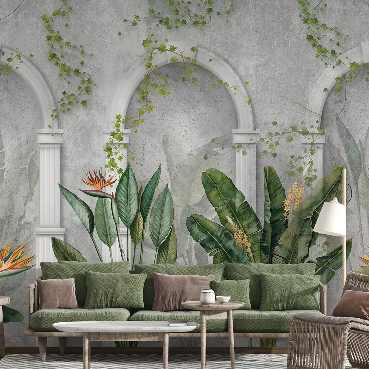 Fototapet Perete din beton cu arcuri și plante tropicale, florale, culori naturale Nr. w04065