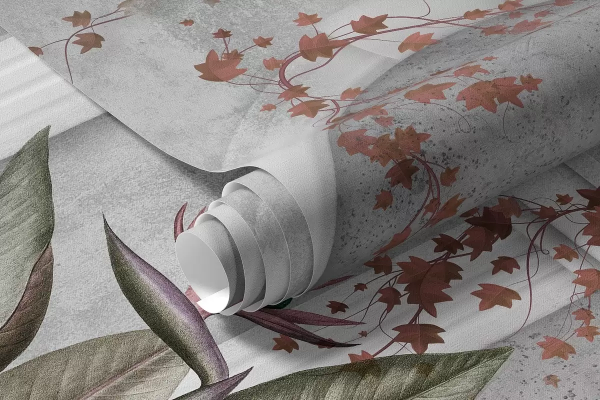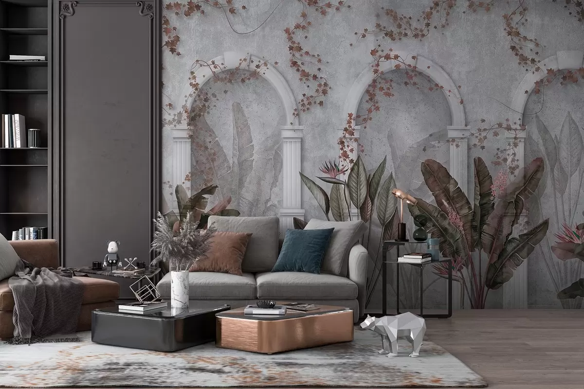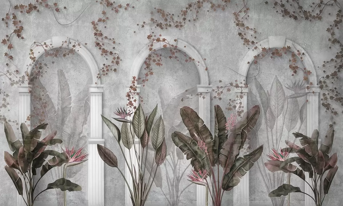 Fototapet Perete din beton cu arcuri și plante tropicale, florale, culori burgundy Nr. w04065v1