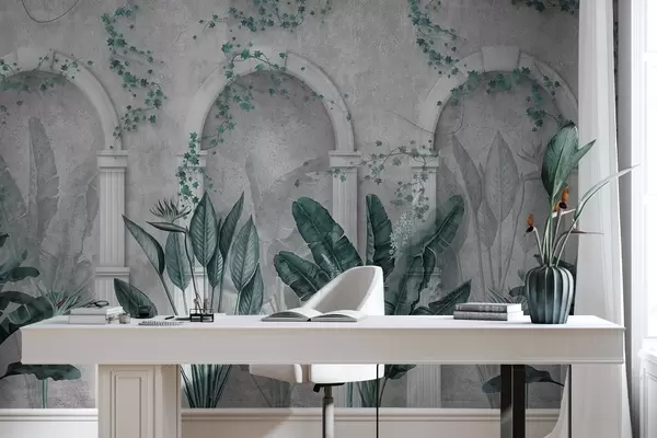 Fototapet Perete din beton cu arcuri și plante tropicale, florale, culori albastre Nr. w04065v2