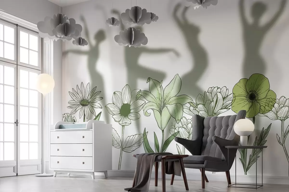 Fototapet Balerini siluete, flori rustice, line art, culori verzi Nr. w04069v1