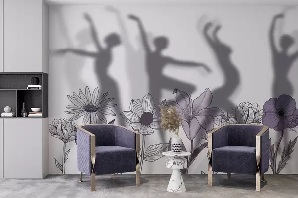Fototapet Balerini siluete, flori rustice, line art, gri și violet culori Nr. w04069v2