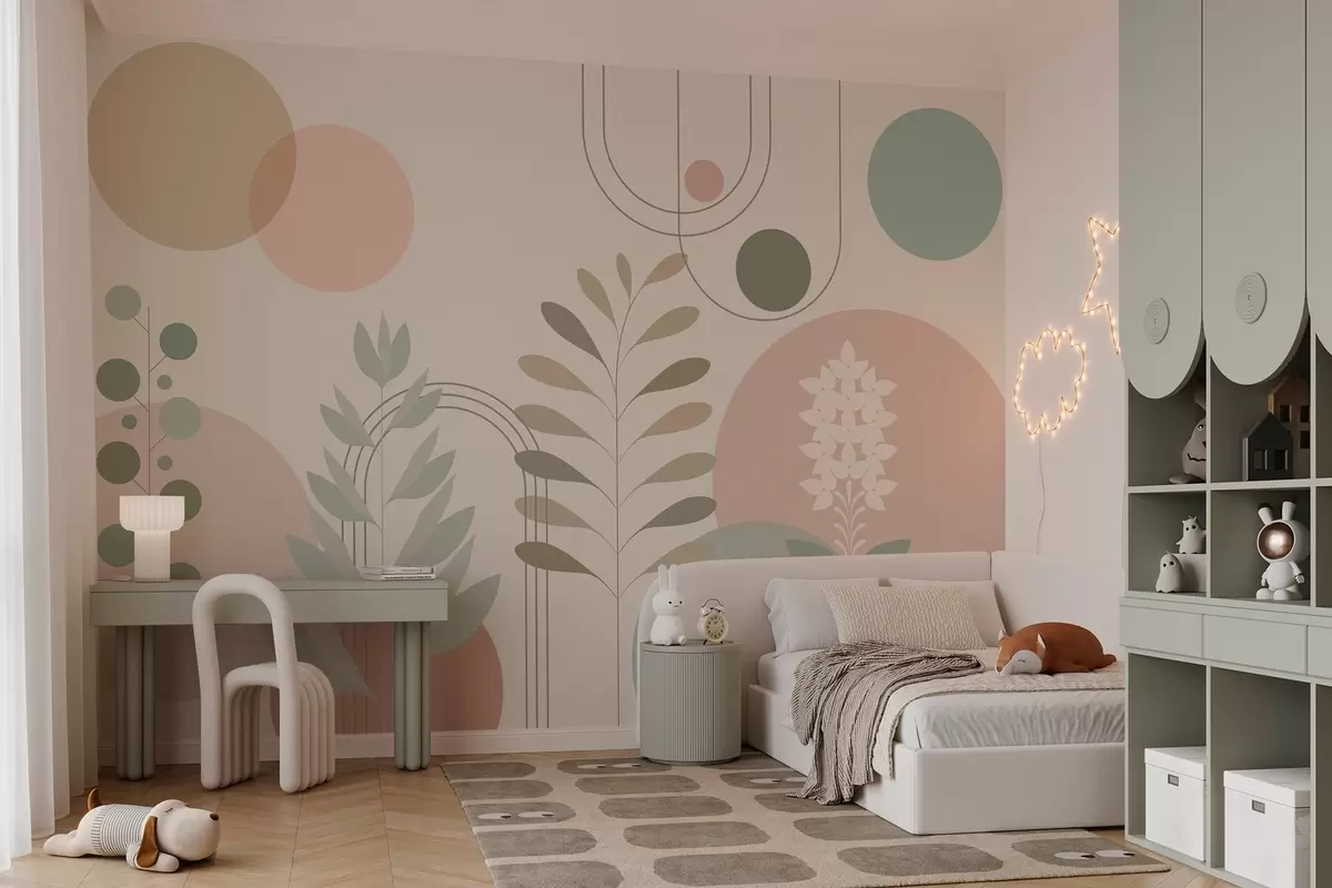 Fototapet abstracție geometrică cu cercuri și plante stilizate pe un fundal crem Nr. w04070