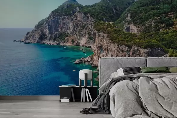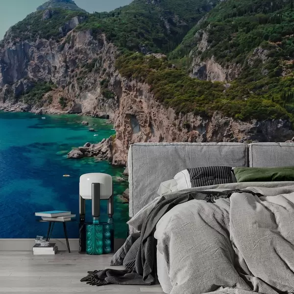 Fototapet Munți stâncoși lângă mare, desen în stil ulei, apă acvamarin Nr. w04096