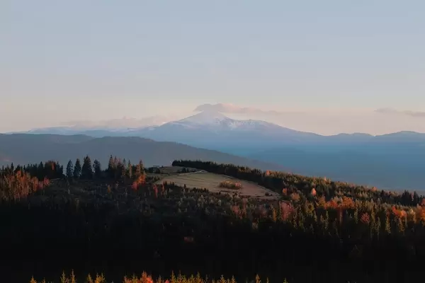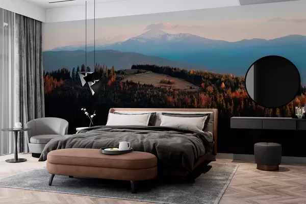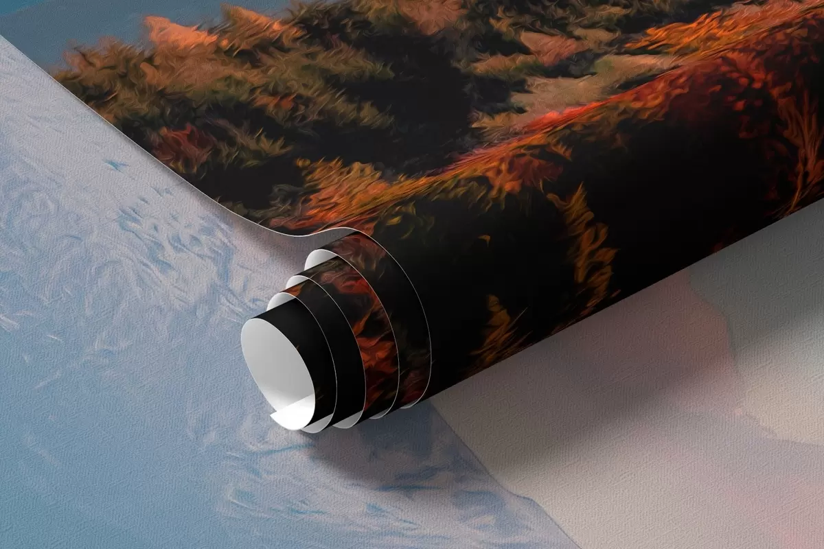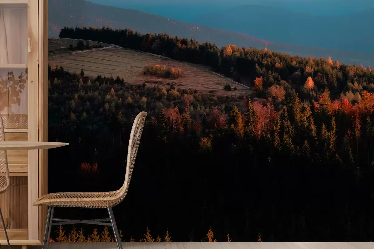 Fototapet Munții Carpați, textura stil ulei, pădure de toamnă, cer apus de soare Nr. w04098