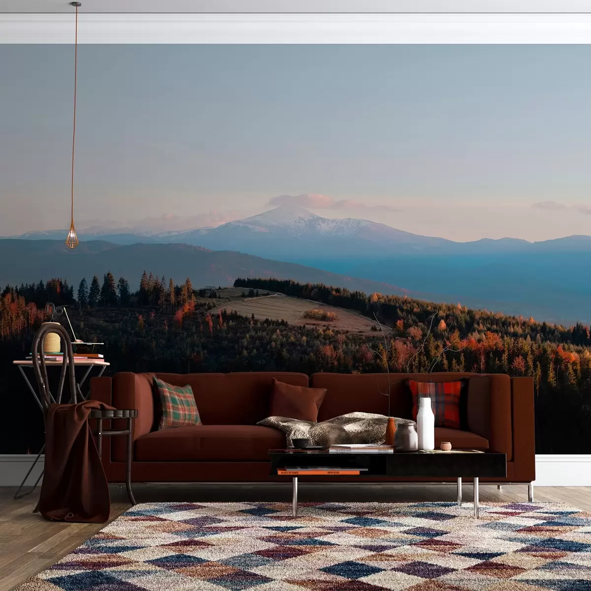 Fototapet Munții Carpați, textura stil ulei, pădure de toamnă, cer apus de soare Nr. w04098