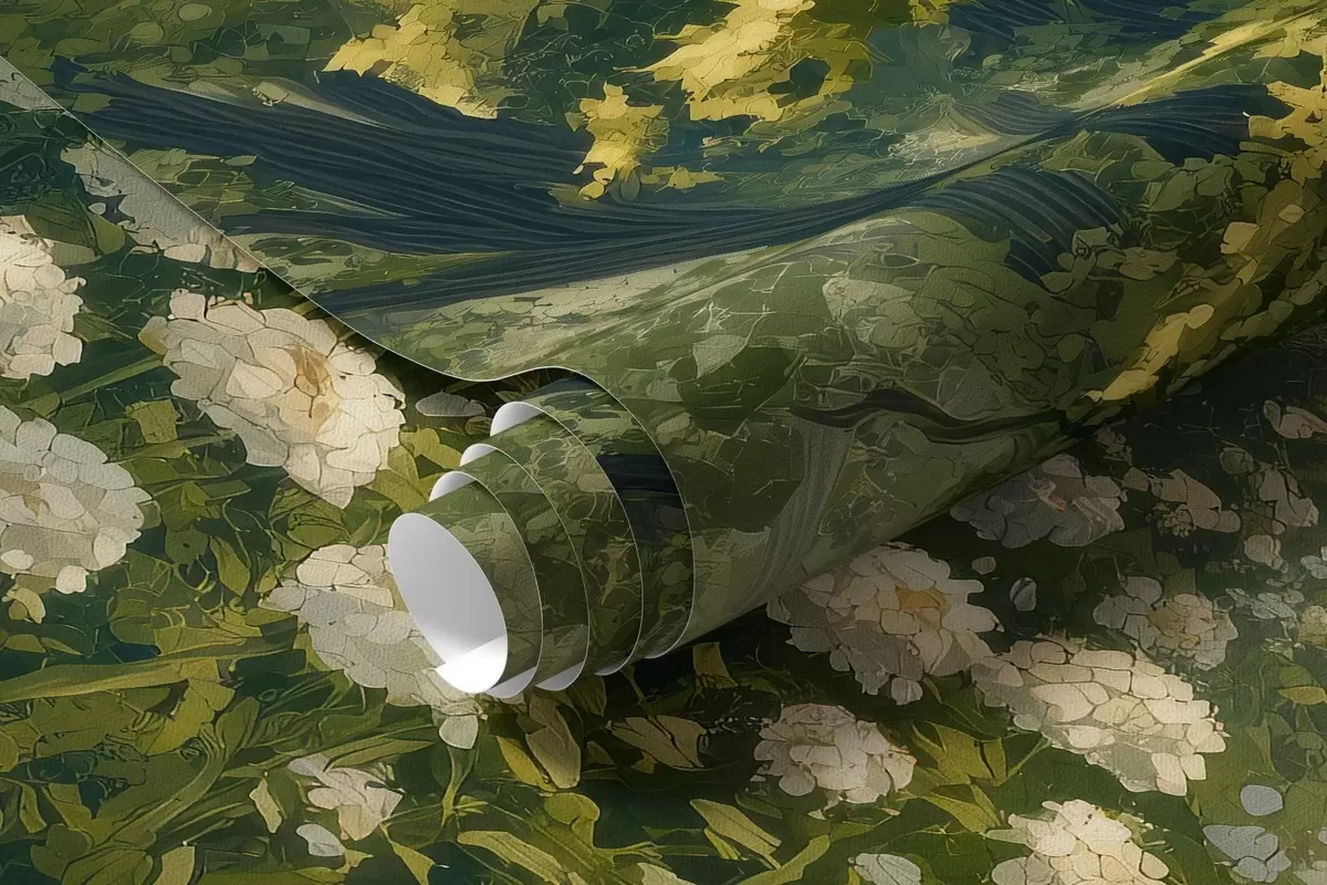 Fototapet Cărare în pădurea verde, flori albe, lumina soarelui, desen în stil acrilic Nr. w04119