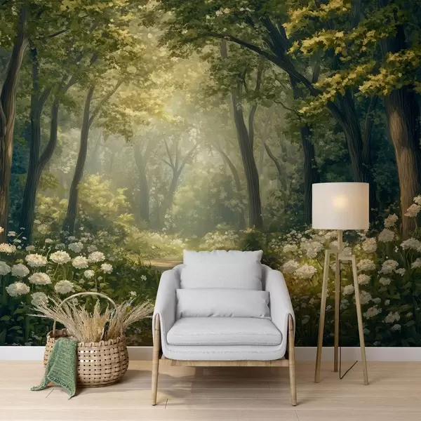 Fototapet Cărare în pădurea verde, flori albe, lumina soarelui, desen în stil acrilic Nr. w04119