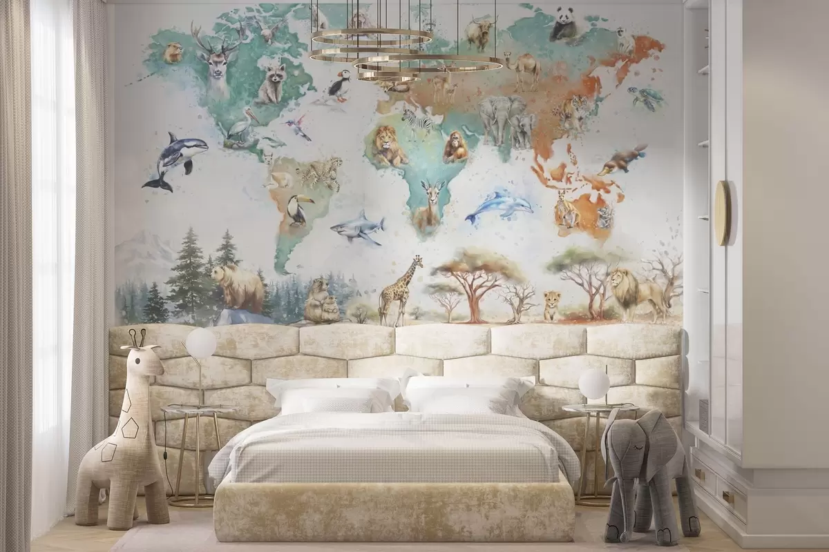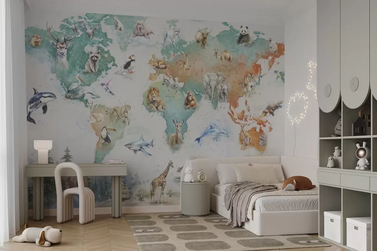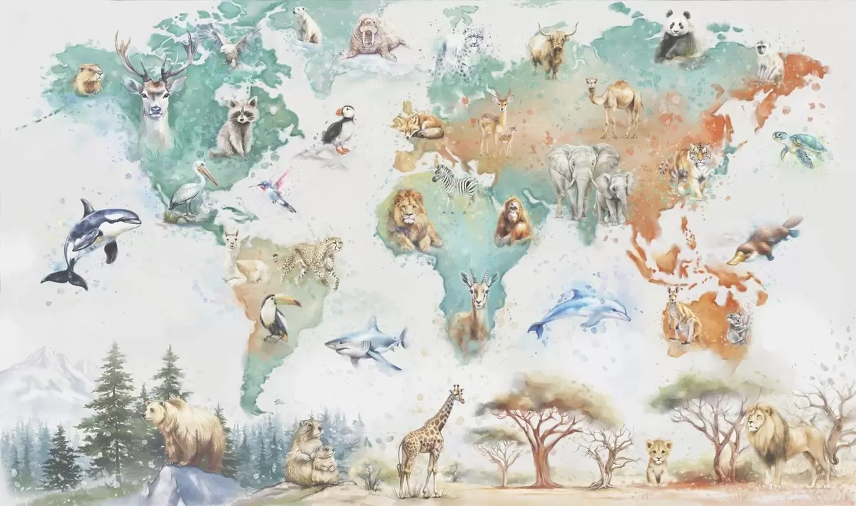 Fototapet Harta lumii cu animale, stilul ilustrației educaționale pentru copii Nr. w04148