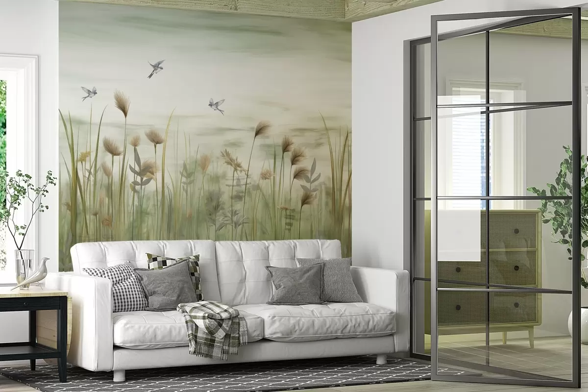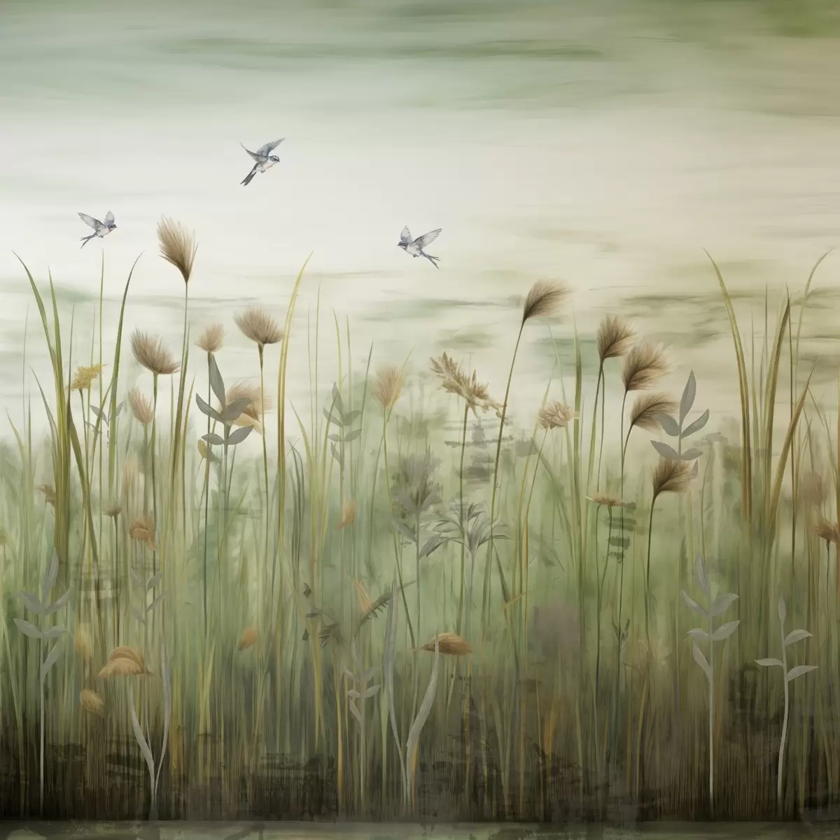 Fototapet Peisaj de iarbă cu rândunele împotriva cerului moale Nr. w04258v1