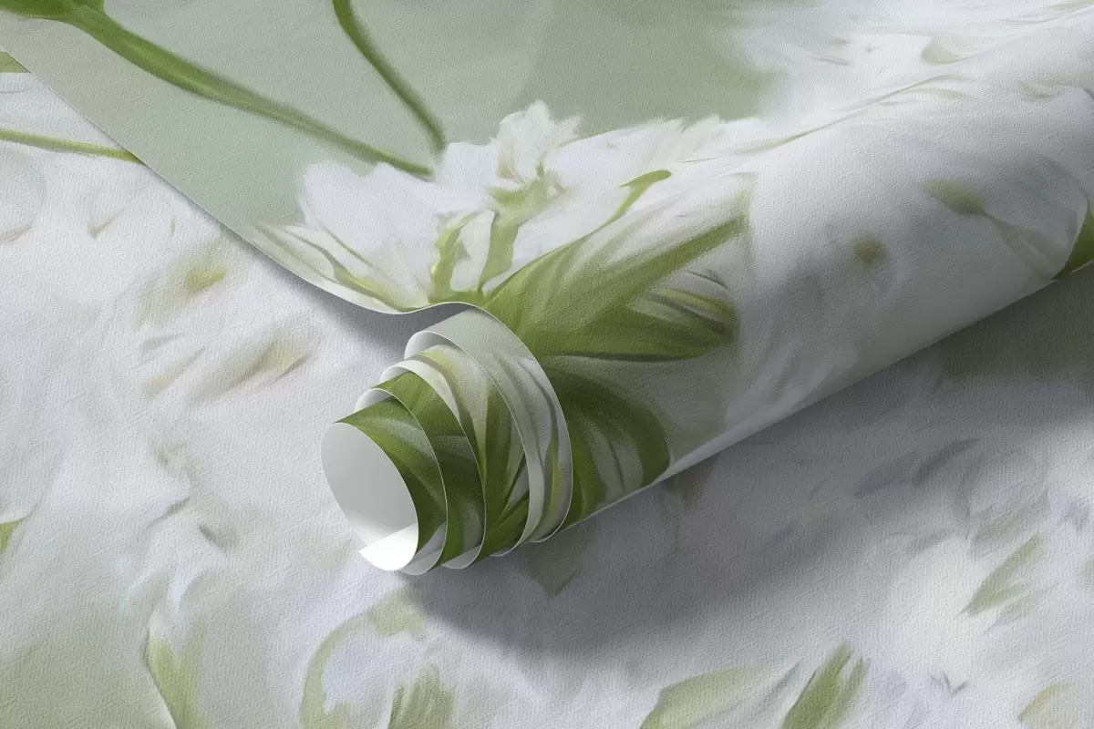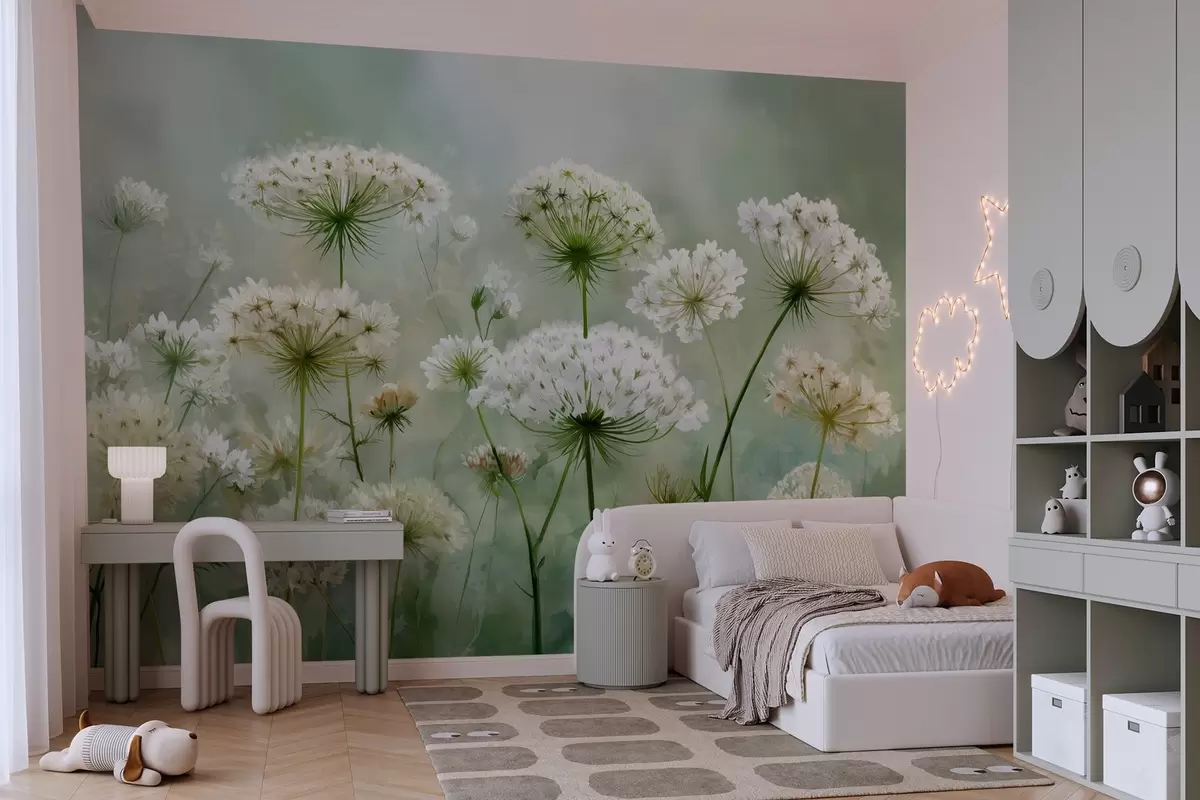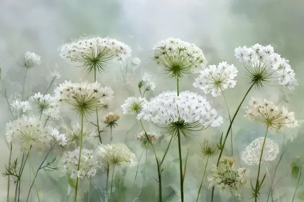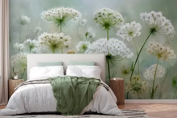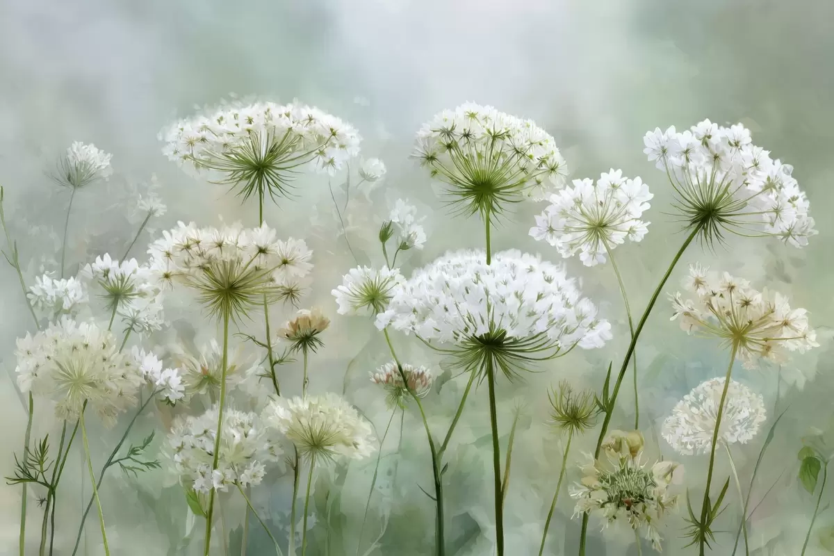 Fototapet flori sălbatice albe delicate Regina Anne, într-un stil pitoresc, tonuri verzi Nr. w04313