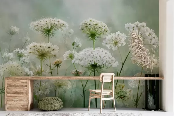 Fototapet flori sălbatice albe delicate Regina Anne, într-un stil pitoresc, tonuri verzi Nr. w04313
