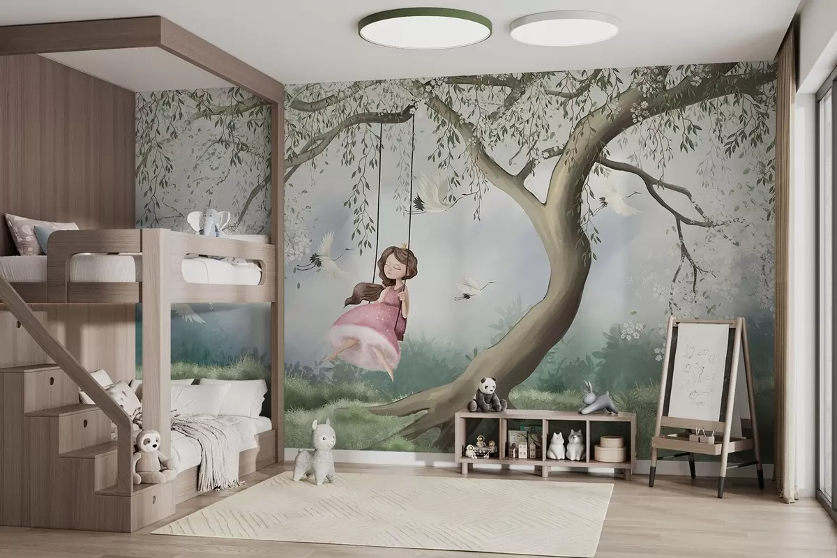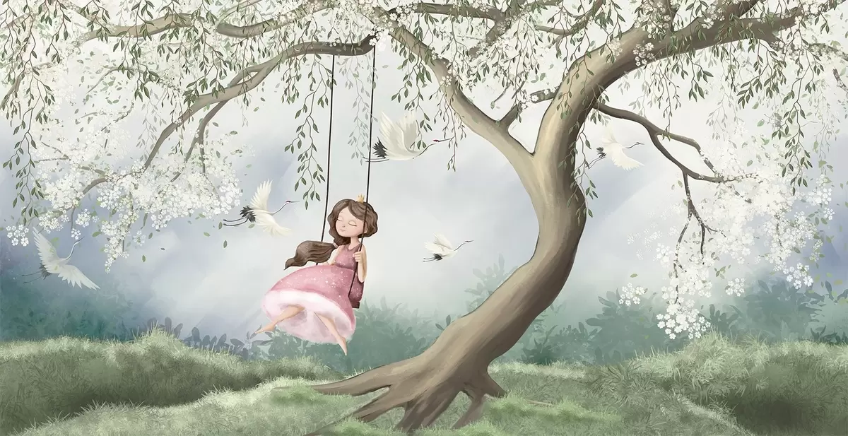 Fototapet Fata pe leagăn sub copac înflorit cu păsări care zboară în jur Nr. w04370