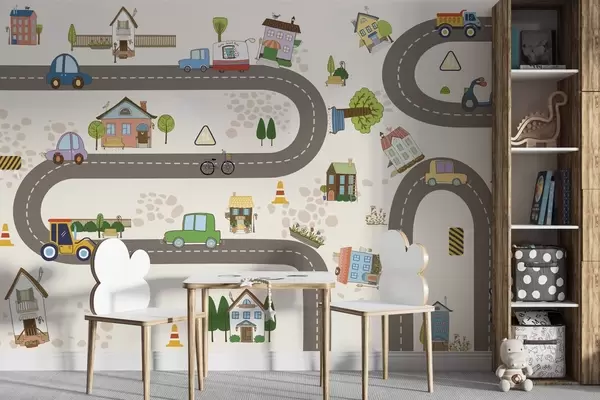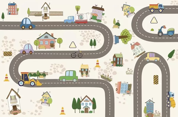 Fototapet Drum pentru copii cu mașini și case colorate Nr. w04404