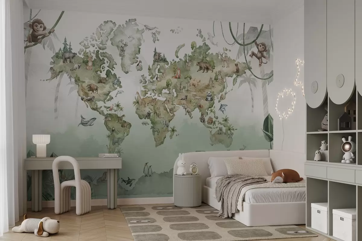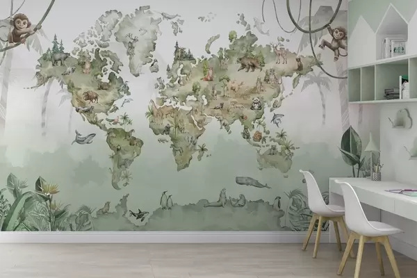 Fototapet Harta lumii în stil acuarelă cu animale Nr. w04418