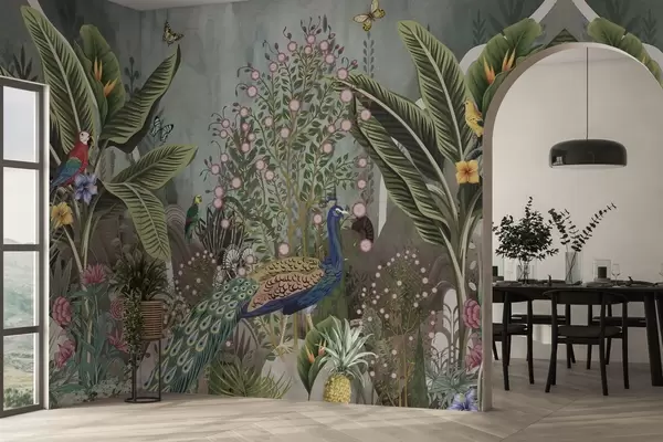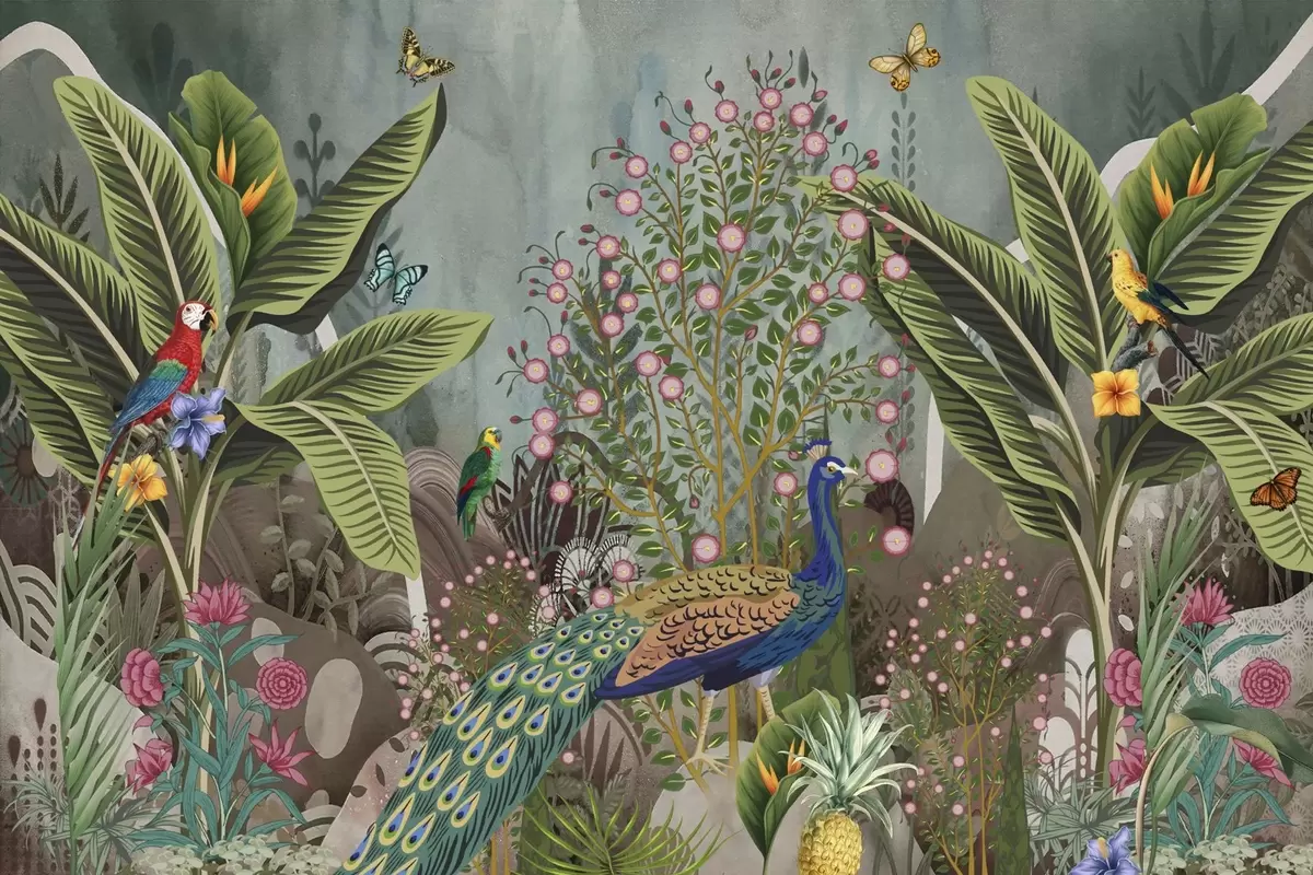 Fototapet Păsări tropicale luminoase și păun printre plante exotice Nr. w04457