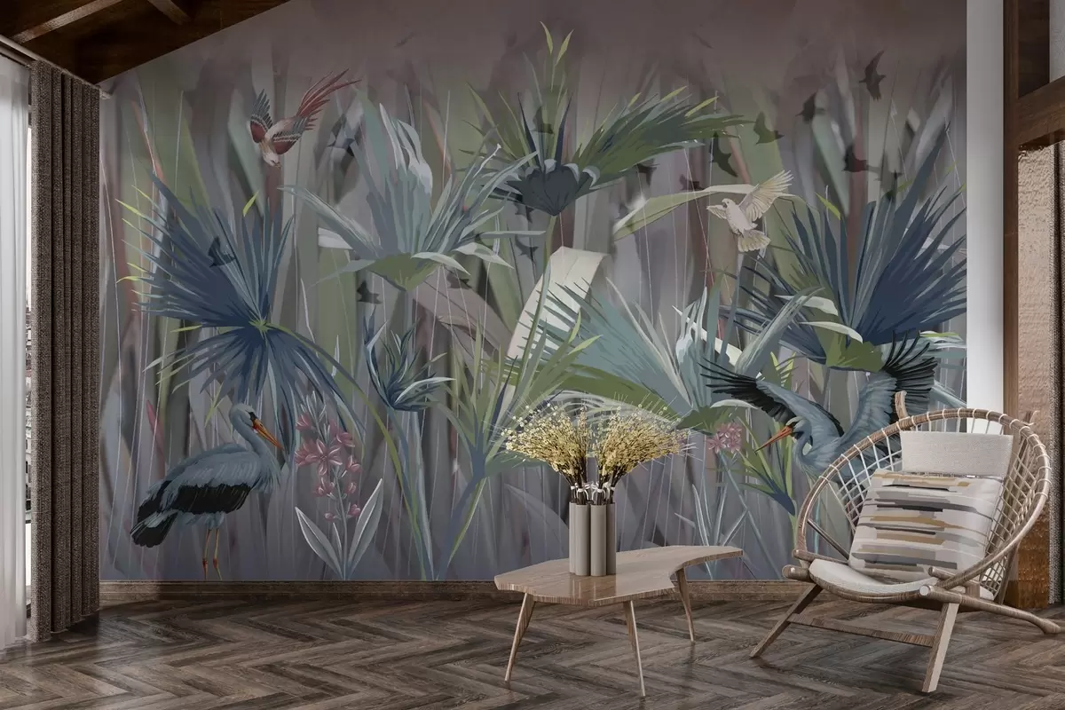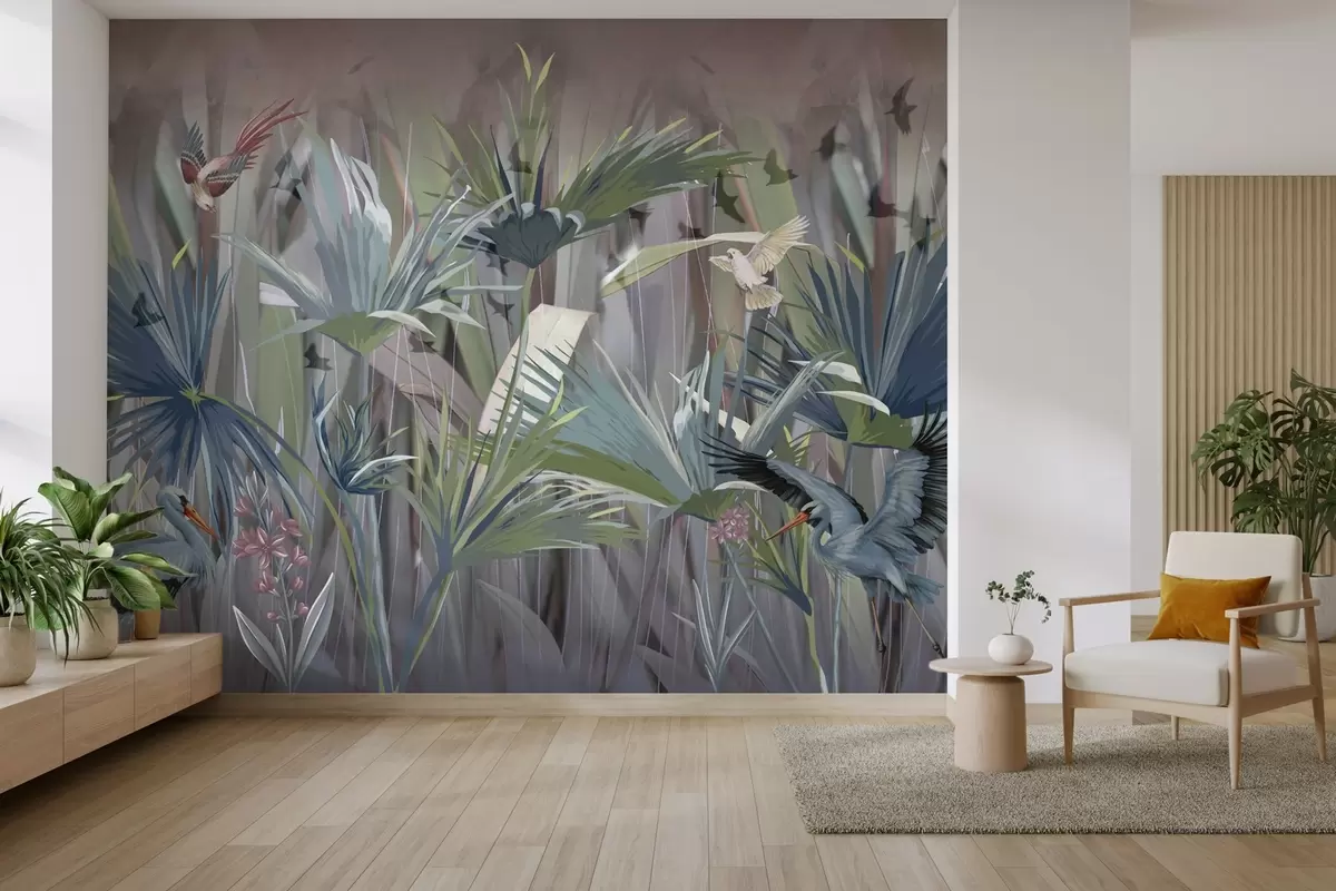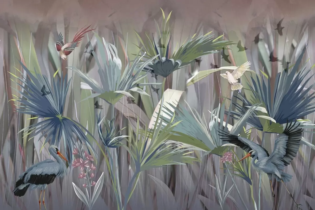 Fototapet Păsări exotice printre frunze de palmier și flori Nr. w04458