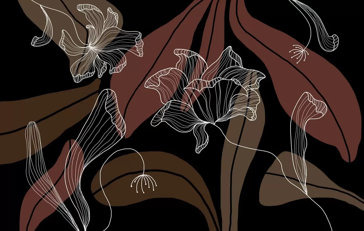 Fototapet frunze și flori abstracte în tonuri pudrate și bej pe un fundal întunecat Nr. w04499v3