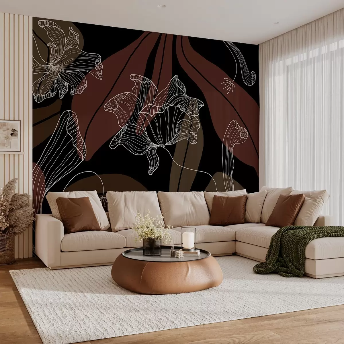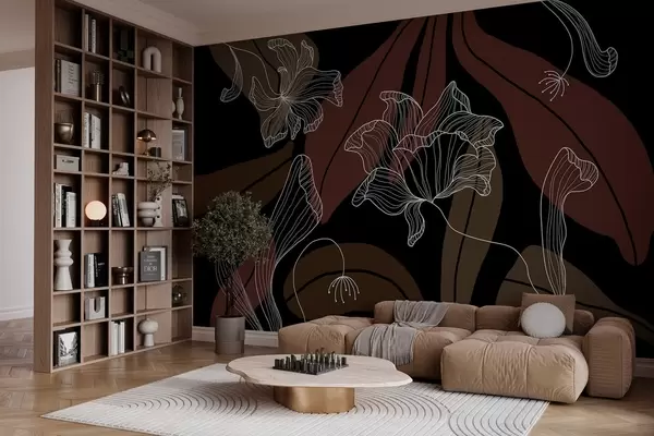 Fototapet frunze și flori abstracte în tonuri pudrate și bej pe un fundal întunecat Nr. w04499v3