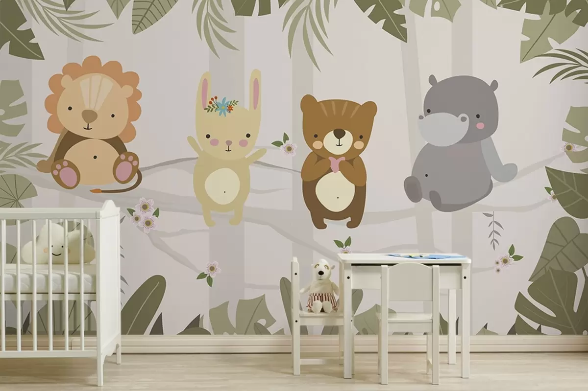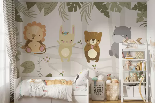 Fototapet Leu drăguț, iepuraș, urs și hipopotam printre frunze Nr. w04682