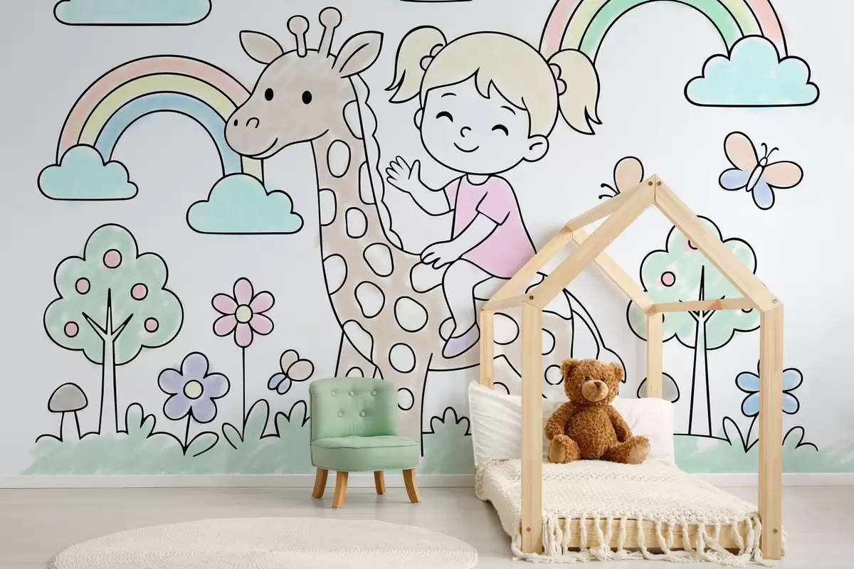 Fototapet fată pe o girafă în stilul unei cărți de colorat pentru copii Nr. w04755