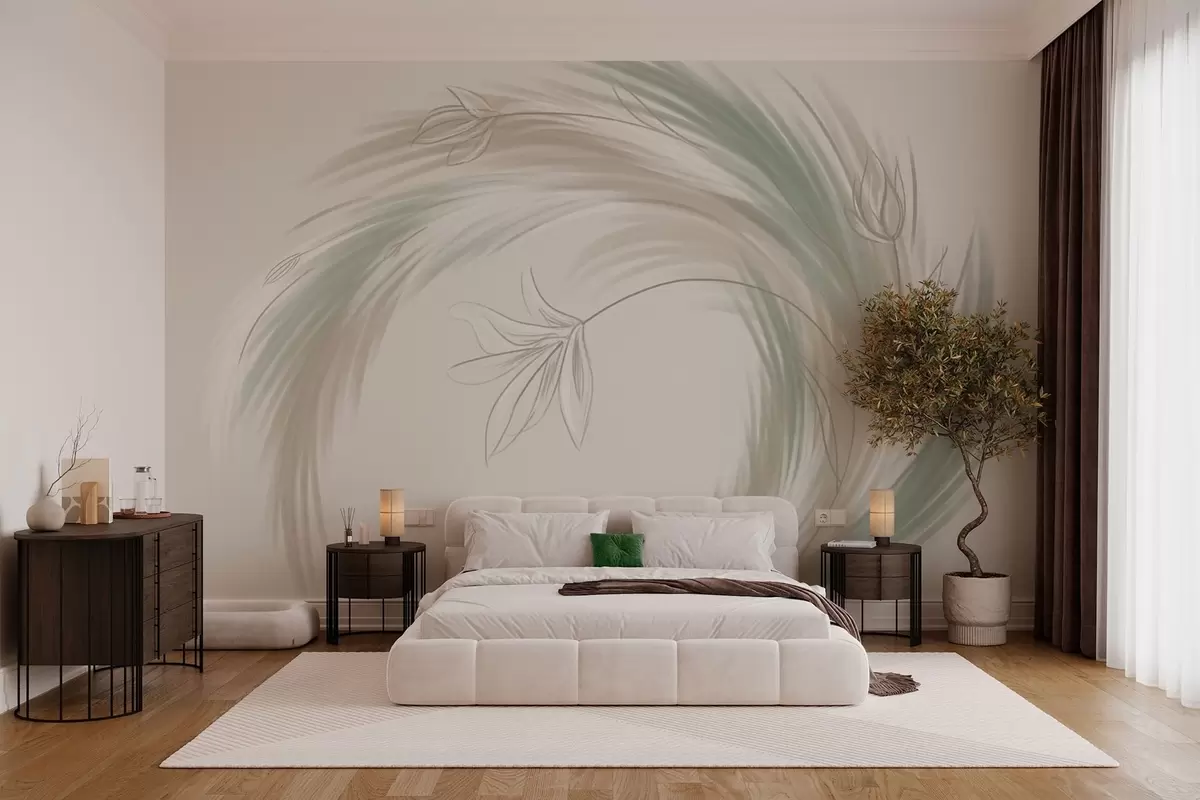Fototapet pene și flori verzi și bej, pictate manual Nr. w04816