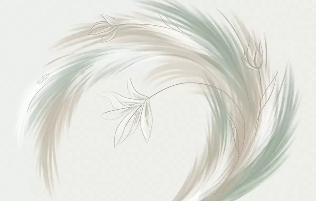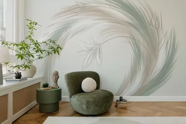 Fototapet pene și flori verzi și bej, pictate manual Nr. w04816