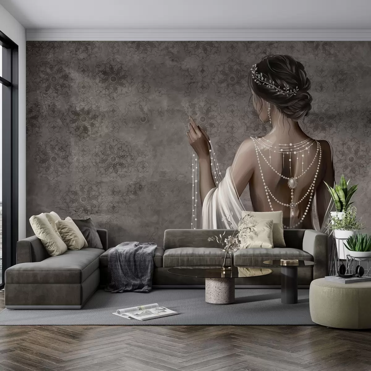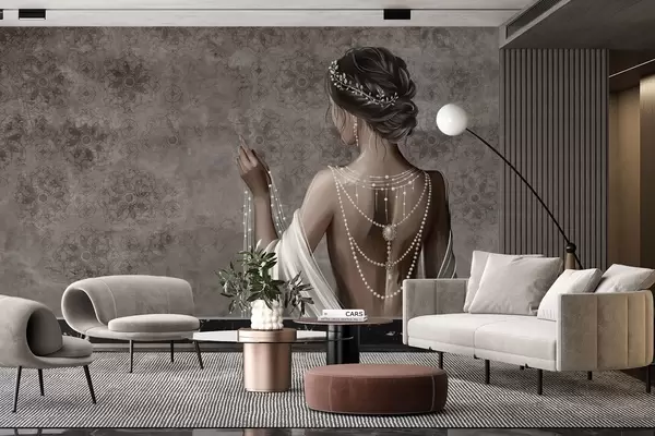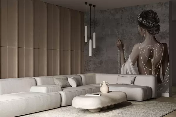 Fototapet Femeie văzută din spate cu perle, fundal cu model de piatră gri Nr. w04854