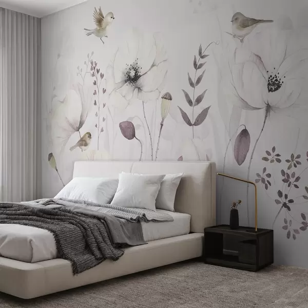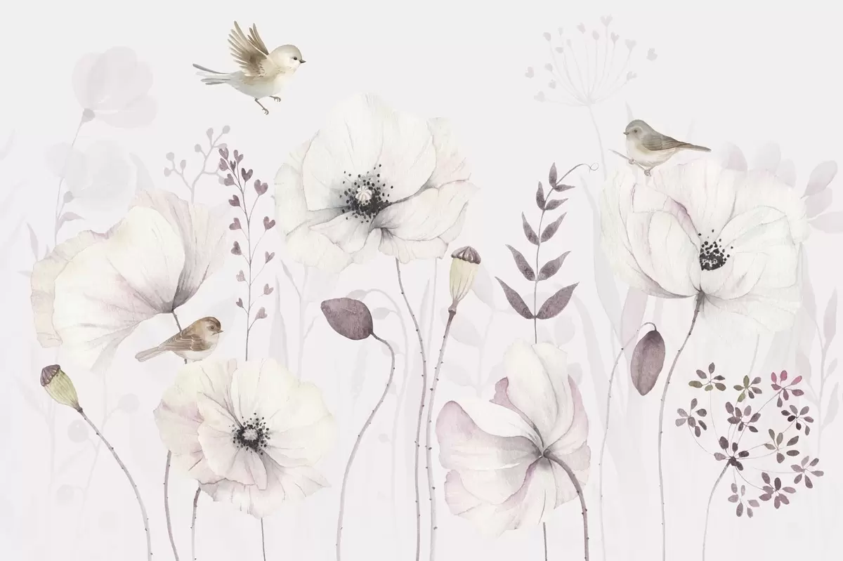 Fototapet Maci acuarelă cu păsări mici în mov pal Nr. w04861