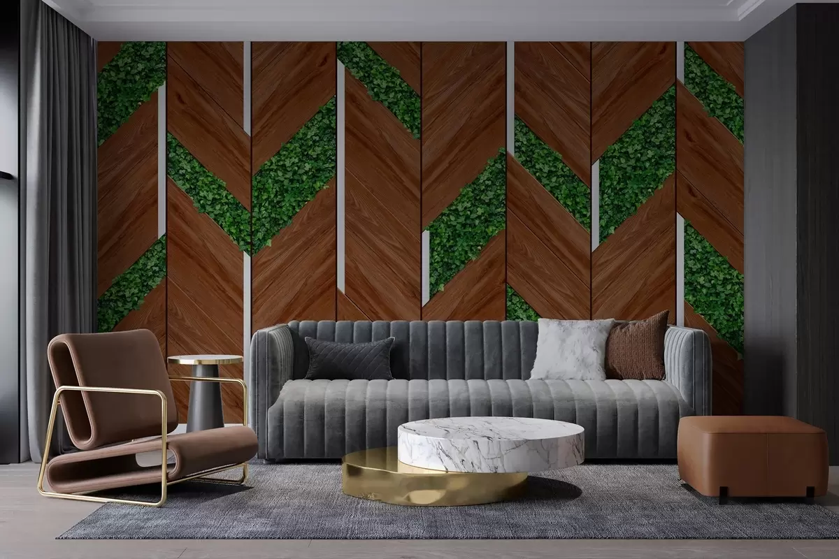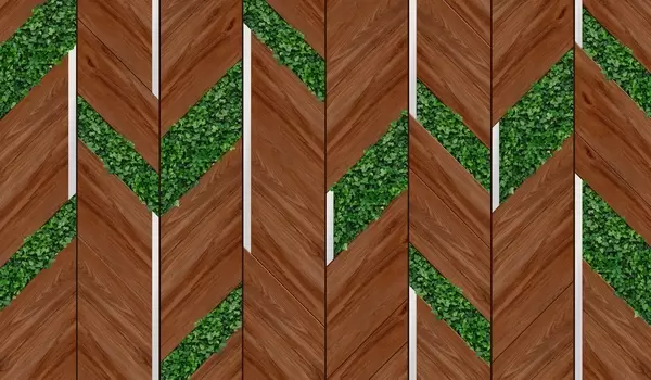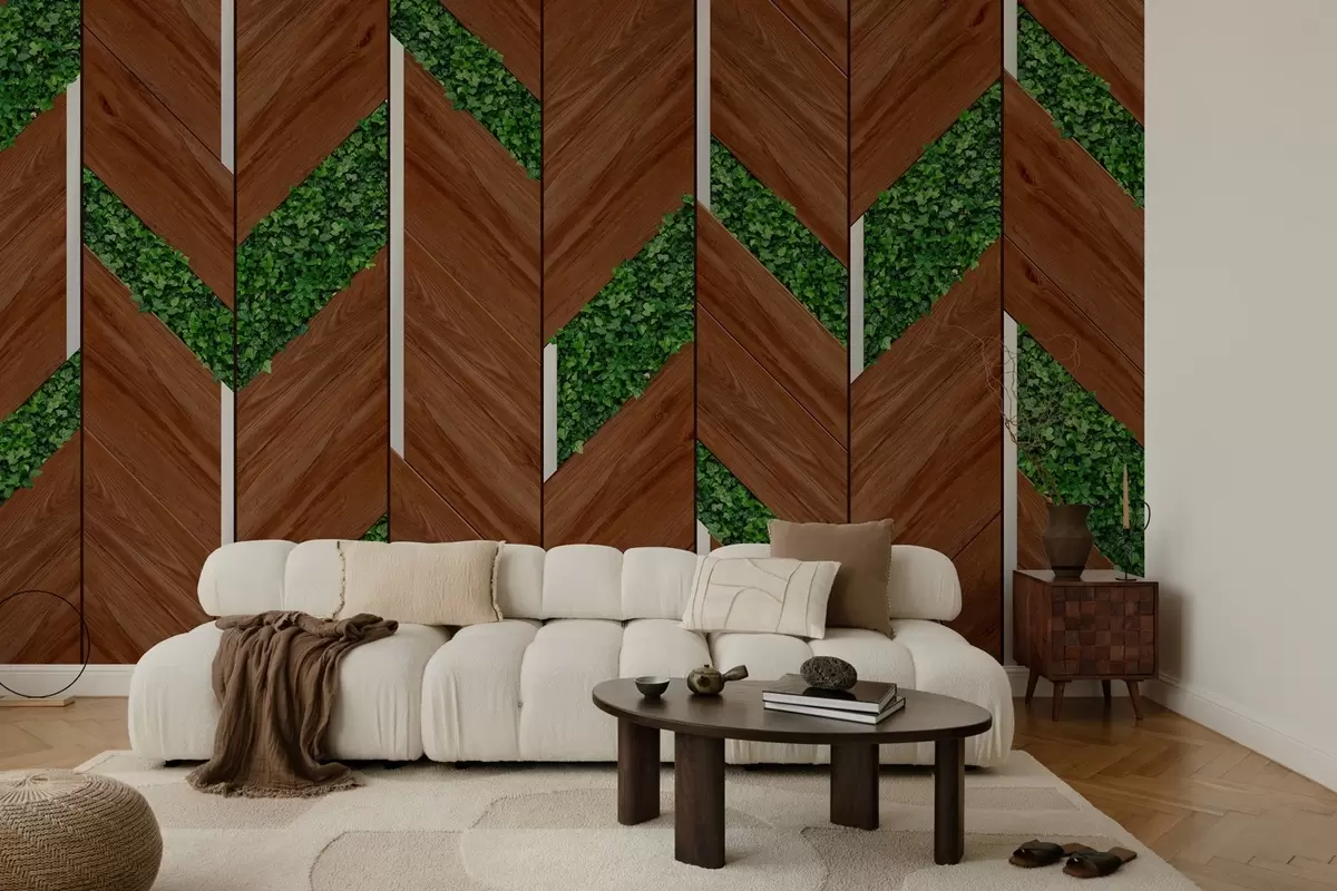 Fototapet imitație de panouri din lemn închis la culoare cu inserții din plante Nr. w04875v1