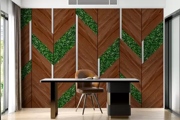 Fototapet imitație de panouri din lemn închis la culoare cu inserții din plante Nr. w04875v1