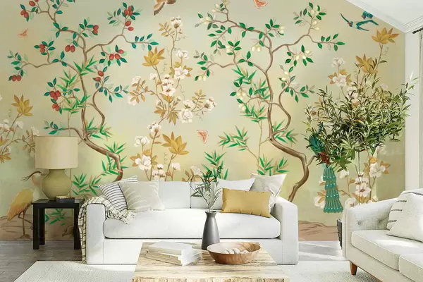 Fototapet Scena cu copaci, flori și păsări, fundal luminos Nr. w05004v1
