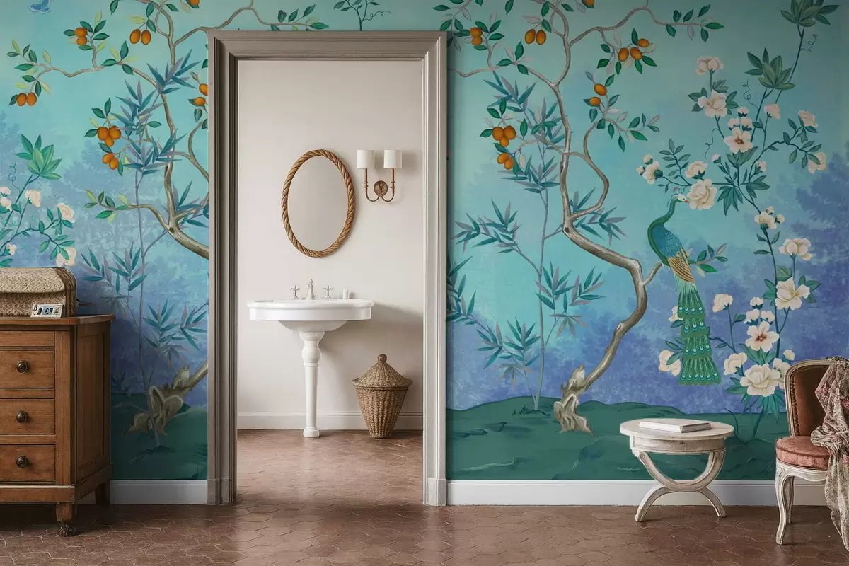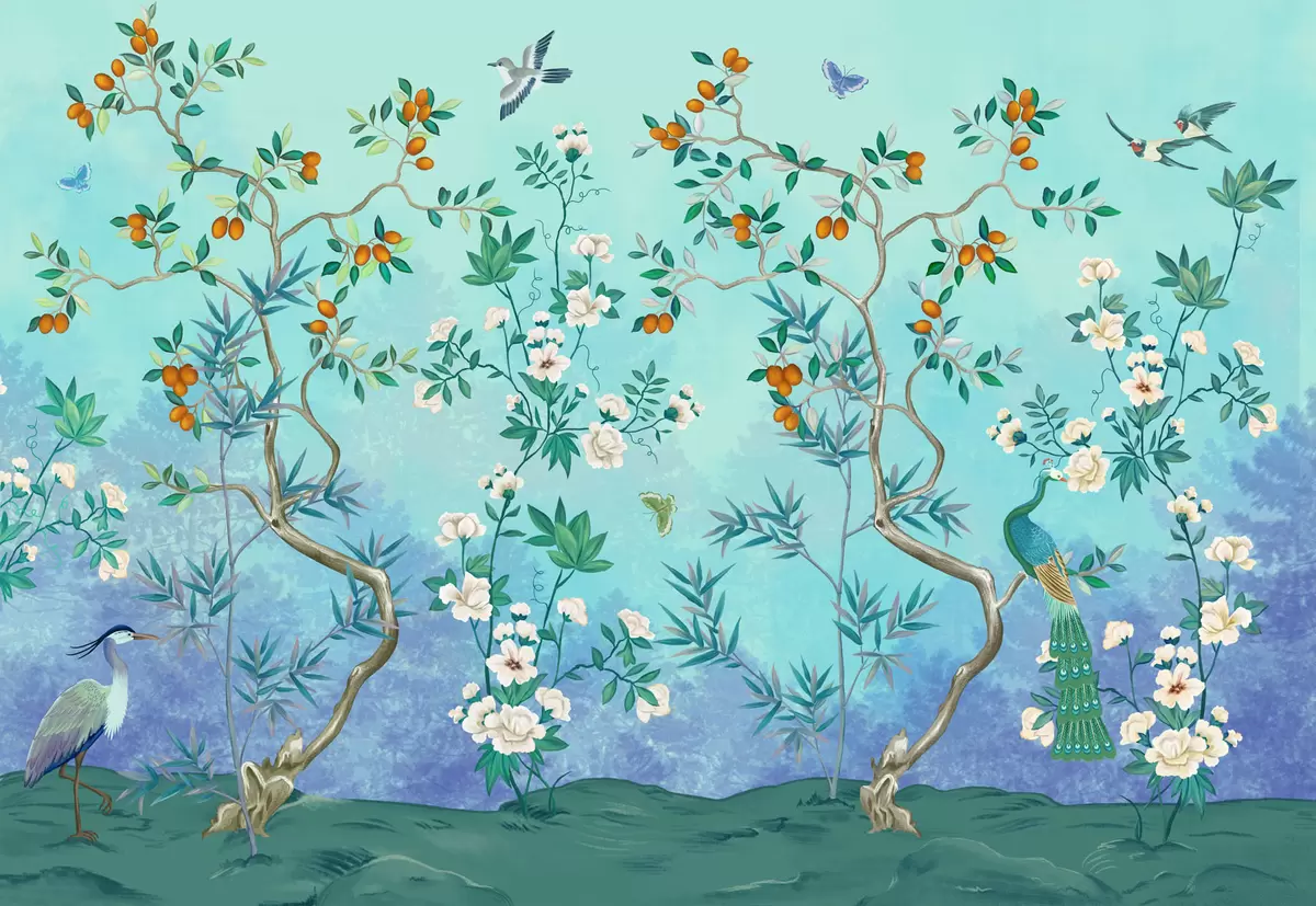 Fototapet Scena cu copaci, flori și păsări, fundal albastru Nr. w05004v2