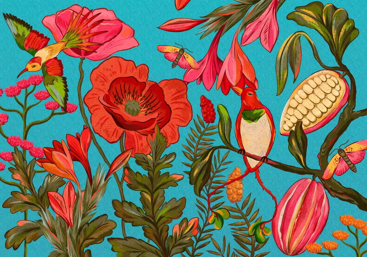 Fototapet Flori decorative și păsări pe fundal albastru Nr. w05036v3