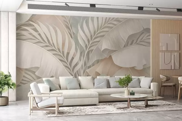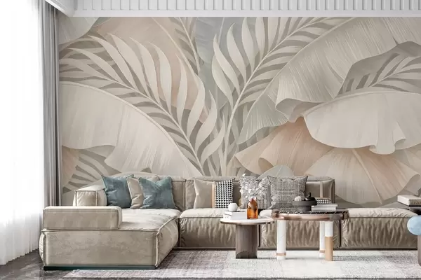 Fototapet frunze tropicale mari în nuanțe de piersică și turcoaz mat Nr. w05062