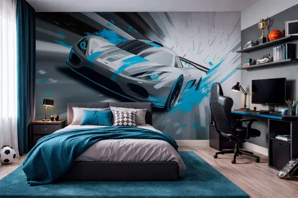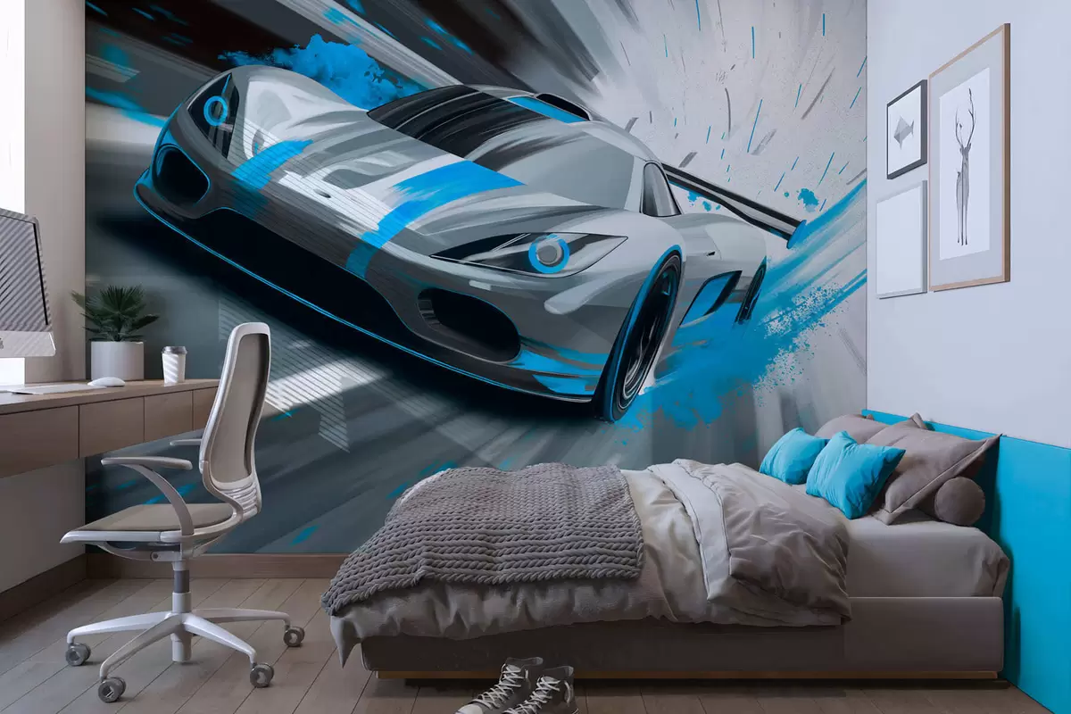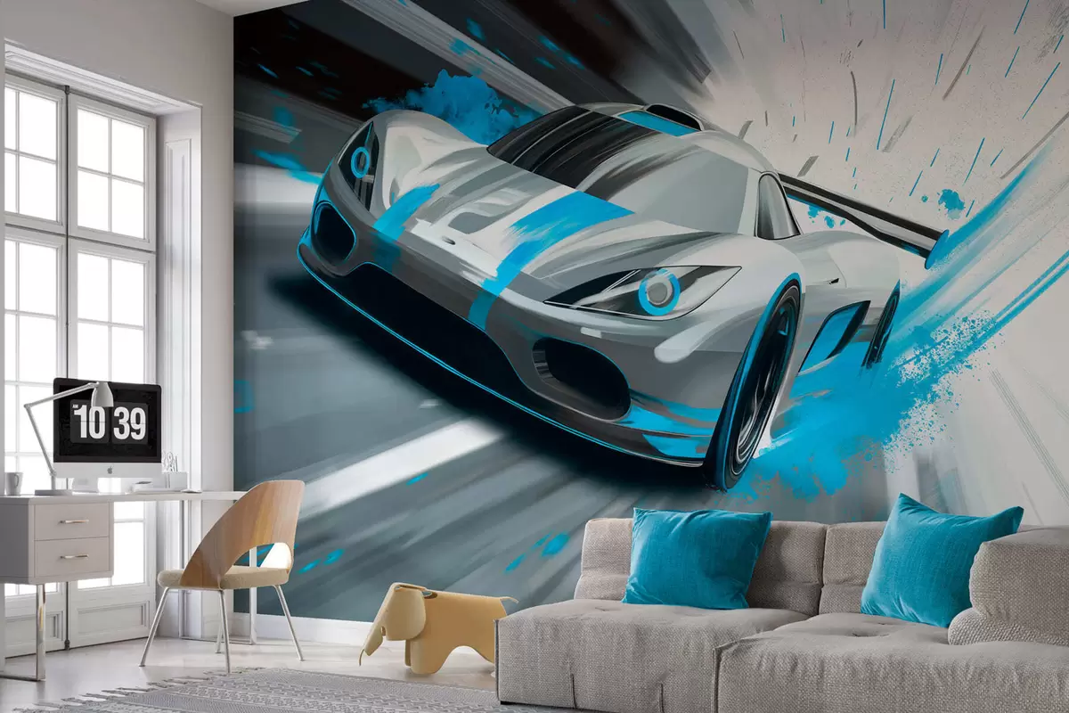 Fototapet mașină sport dinamică în stil de desen digital cu accente turcoaz Nr. w05069v3