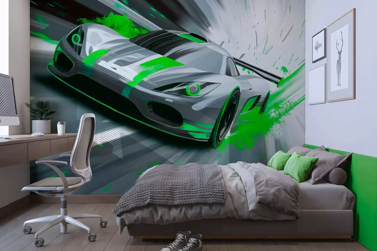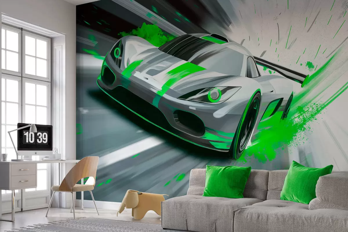 Fototapet mașină sport dinamică în stil de desen digital cu accente verzi Nr. w05069v4