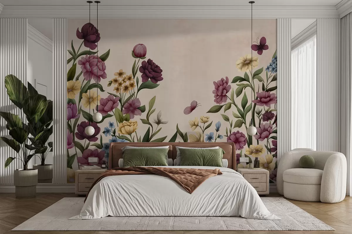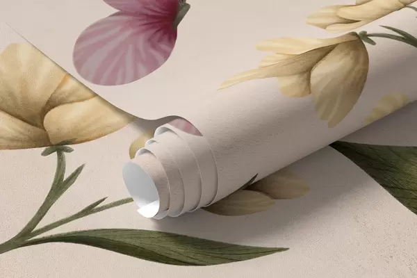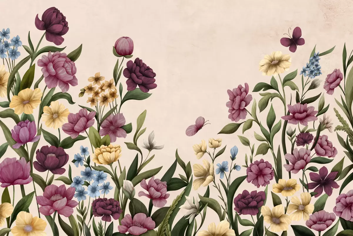 Fototapet Compoziție florală cu plante și fluturi pe fundal deschis Nr. w05072