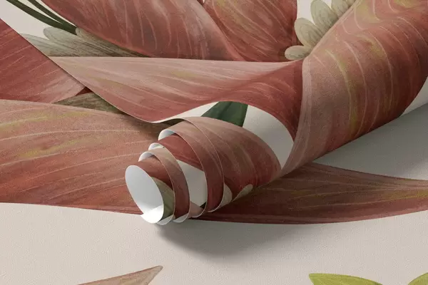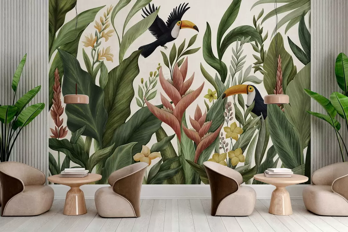 Fototapet Plante tropicale și păsări cu cioc mare pe fundal deschis Nr. w05088v1