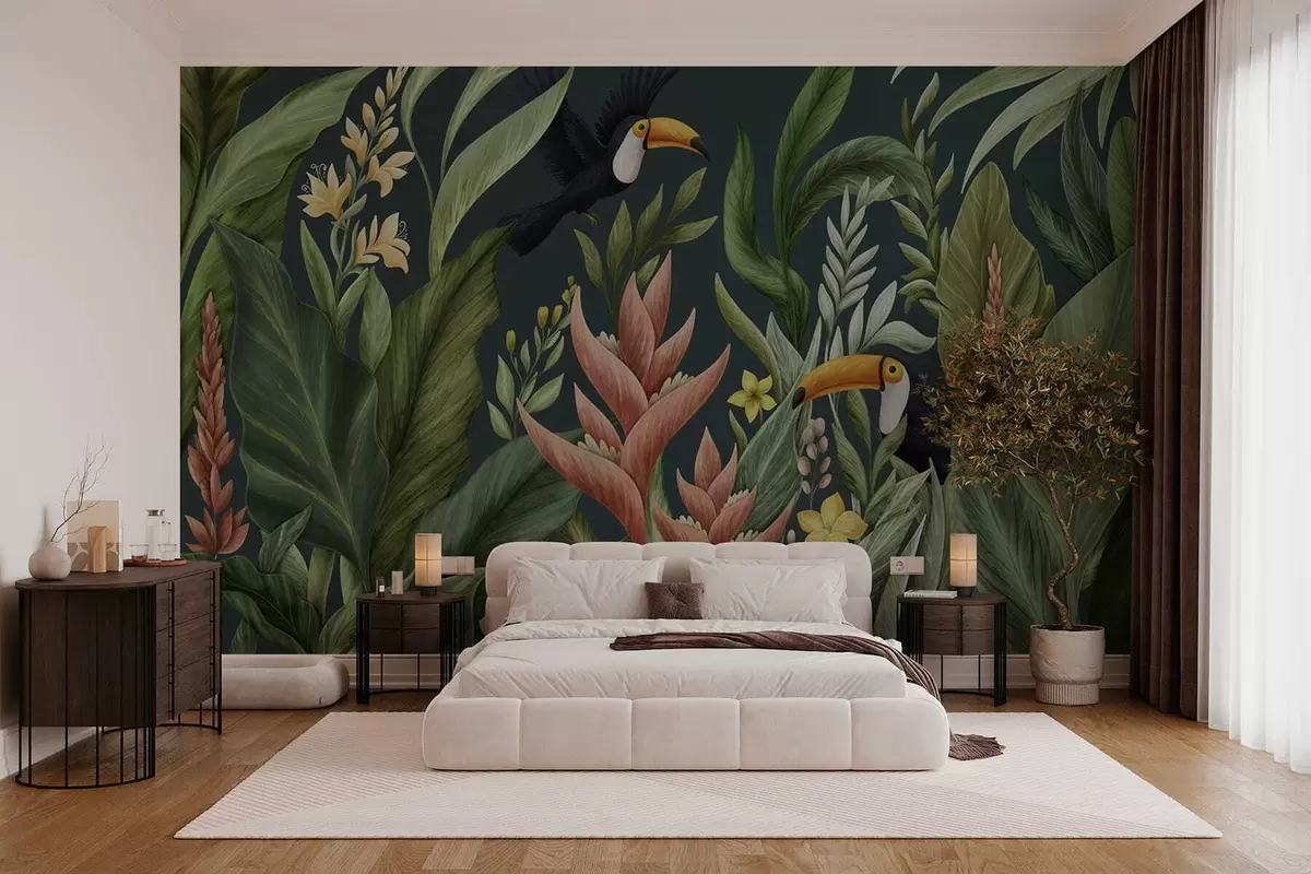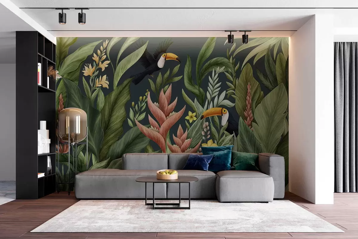 Fototapet Plante tropicale și păsări cu cioc mare pe fundal întunecat Nr. w05088v2
