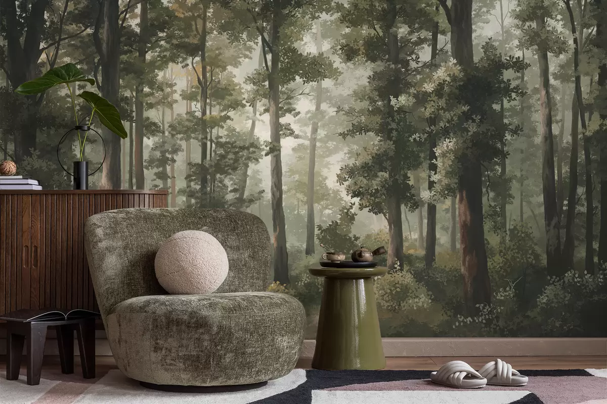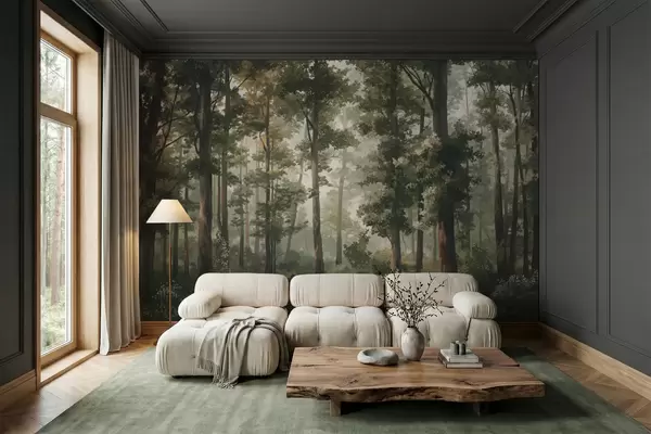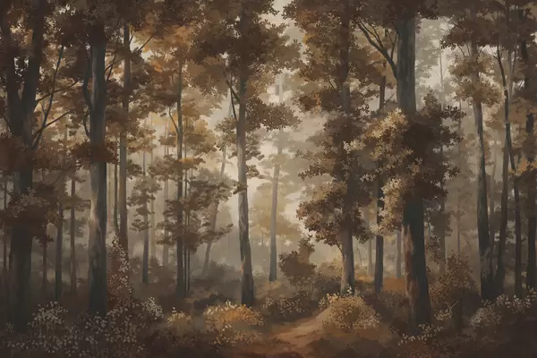 Fototapet Ilustrație cu pădure cu ceață, copaci înalți și o potecă Nr. w05089