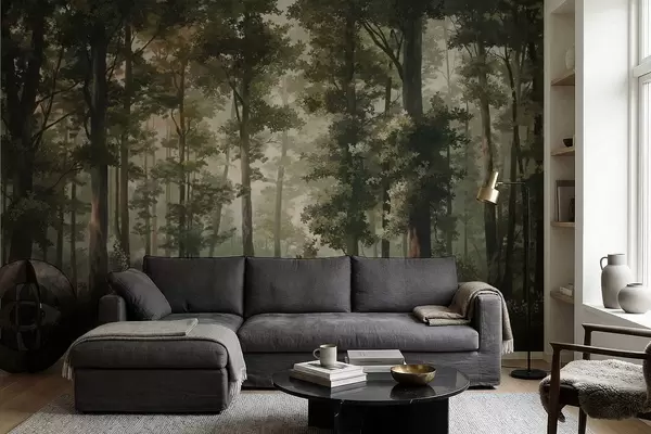 Fototapet Ilustrație cu pădure cu ceață, copaci înalți și o potecă Nr. w05089