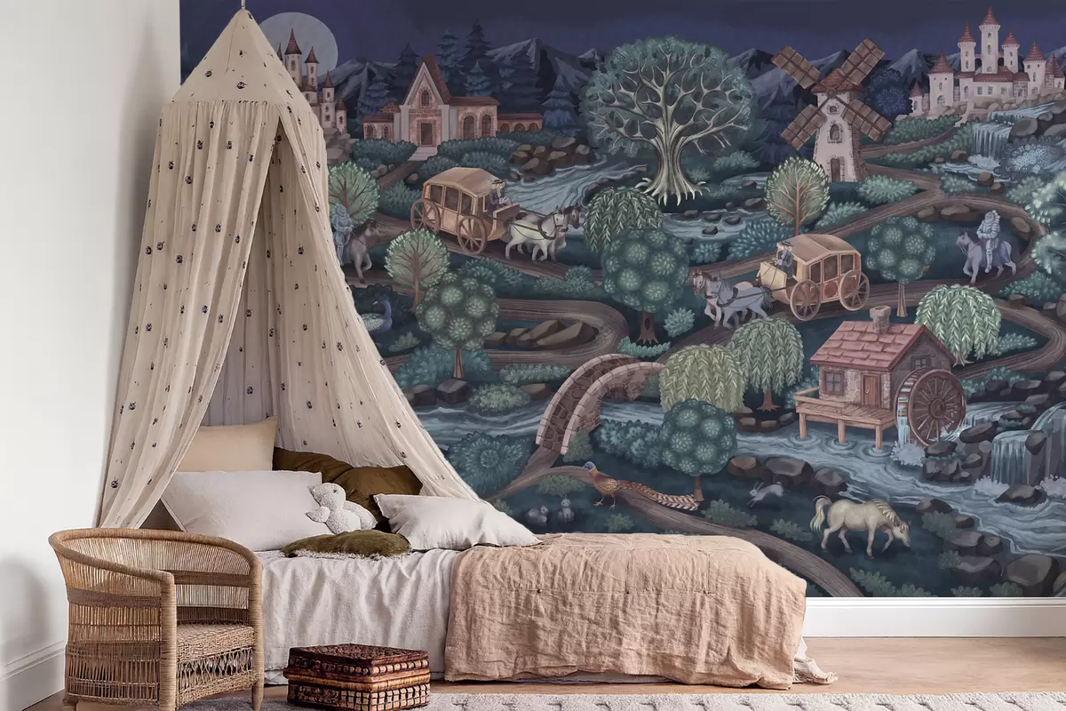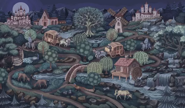 Fototapet Scena nocturnă cu castele, mori și pădure Nr. w05091