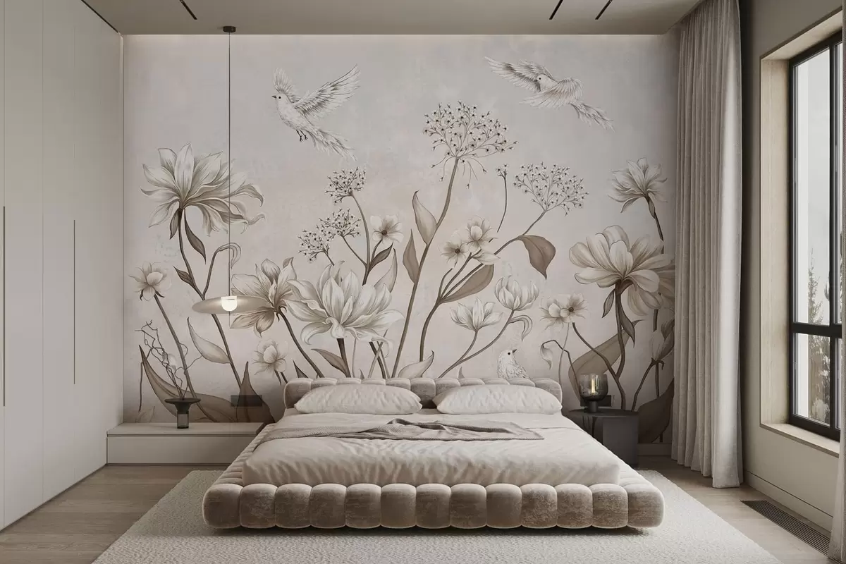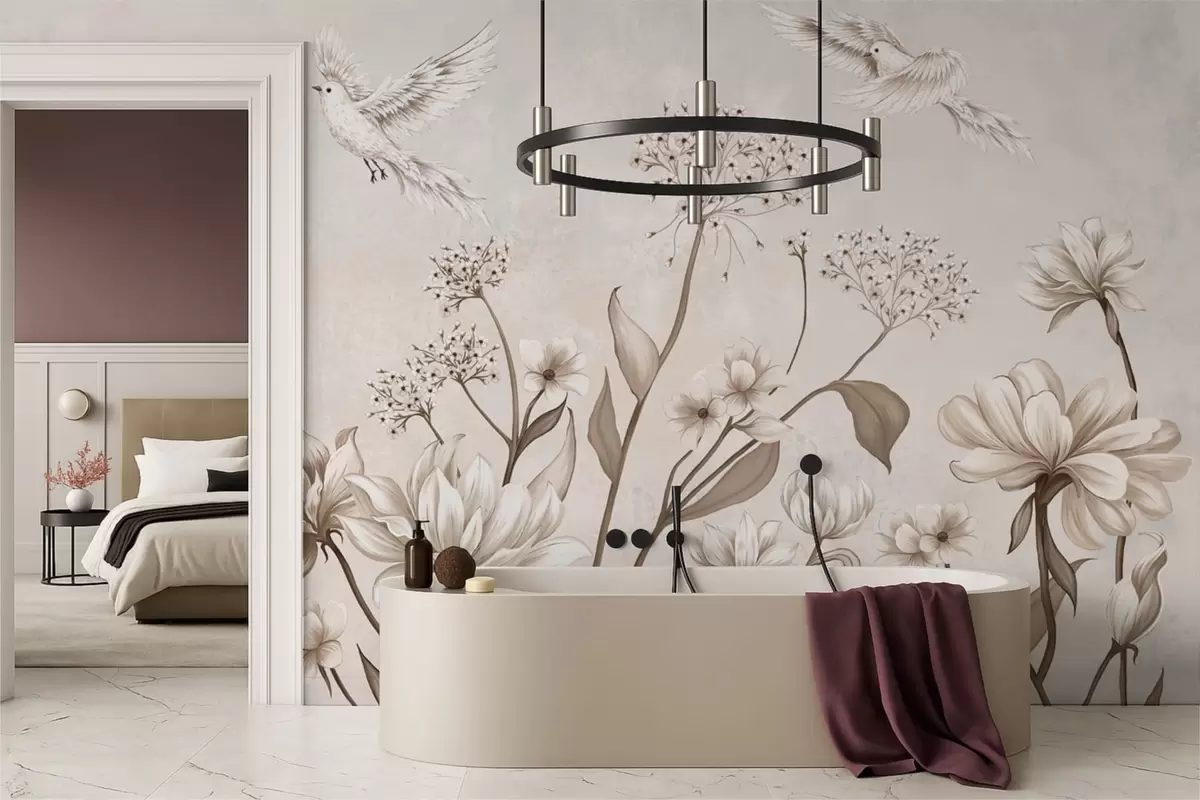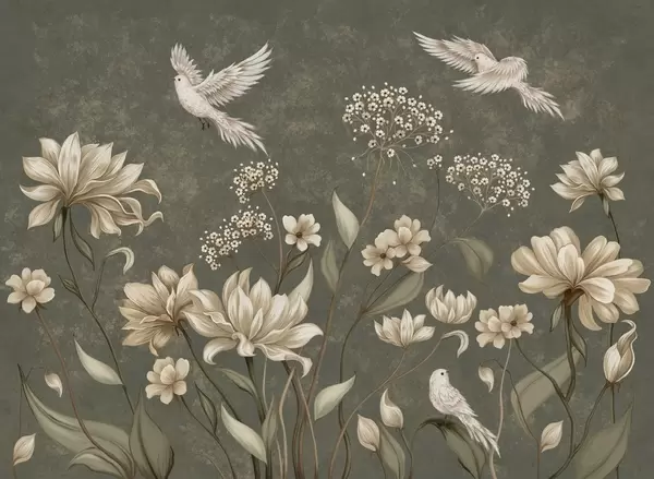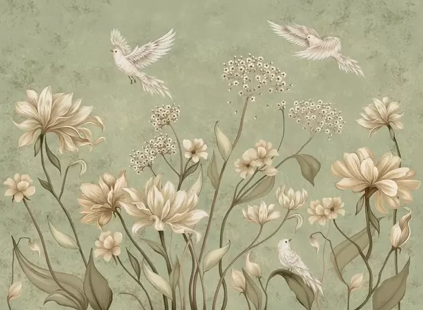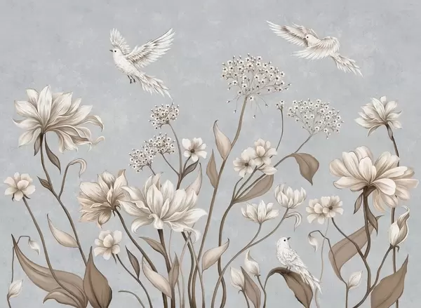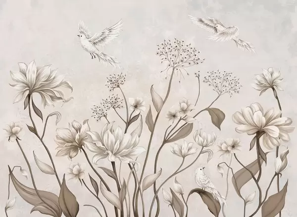 Fototapet Flori delicate și păsări pe un fundal deschis Nr. w05118
