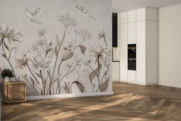 Fototapet Flori delicate și păsări pe un fundal deschis Nr. w05118