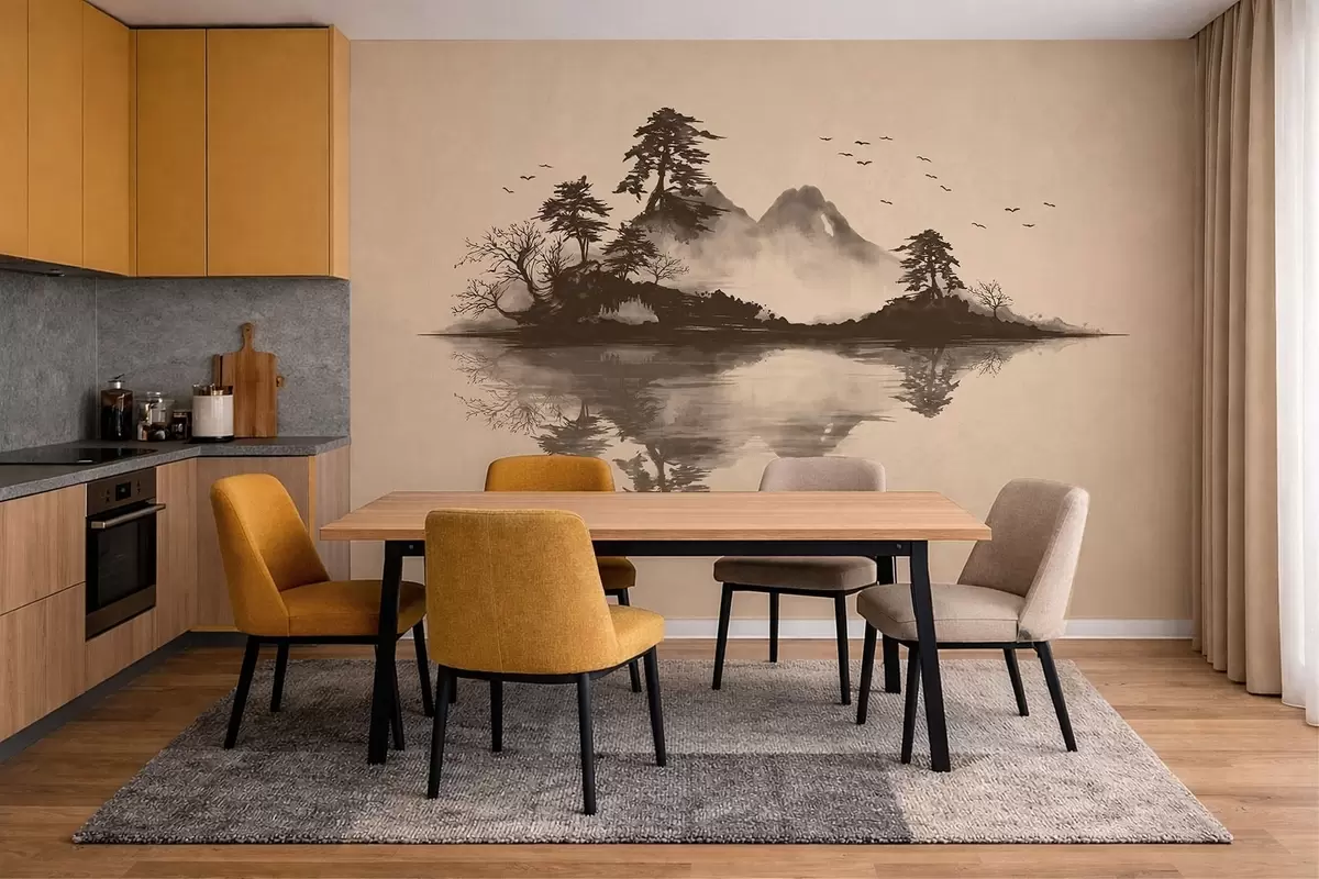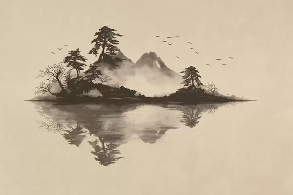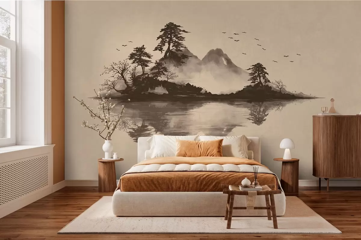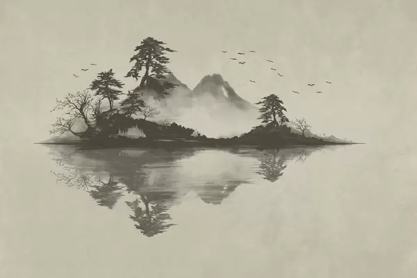 Fototapet Peisaj montan în stil sumi-e, cu pini și reflexie Nr. w05124